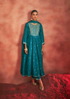 An exquisite blue jacquard Anarkali kurti, intricately embroidered for a touch of elegance, paired with viscose bottoms showcasing refined design details. A tonal organza dupatta completes this traditional ensemble, perfect for festive celebrations. Radiate regal charm with this timeless set.
