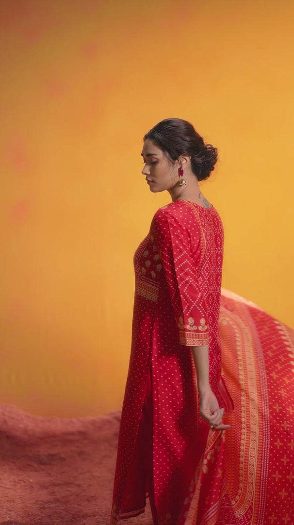 Radiate festive charm with this Bandhani Digital Print Kurta Set in rich red. The Russian silk kurti is adorned with delicate handwork detailing and paired with a tonal viscose bottom. Completing the look is a coordinated Russian silk Bandhani print dupatta, adding vibrance and grace to every occasion.