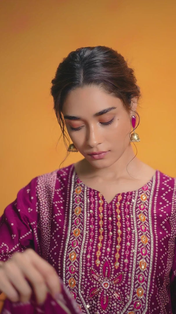 Drape yourself in sophistication with this Bandhani Digital Print Kurta Set in deep wine. The kurti features exquisite handwork on Russian silk with intricate Bandhani prints, complemented by a tonal viscose bottom. The matching Russian silk dupatta completes the look with timeless allure.