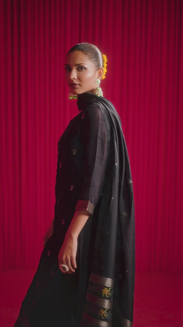 Immerse yourself in the artisanal luxury of Bhagalpuri silk, with our jacquard kurti with handwork and Meena detailing. Styled with a tonal viscose bottom and a matching Bhagalpuri silk jacquard dupatta, this ensemble exudes elegance, sophistication, and a timeless charm perfect for special occasions.