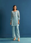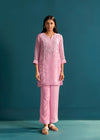 The Blush Pure Organza Coords radiates understated elegance and exceptional craftsmanship. The kurti, crafted from pure organza, showcases intricate heavy embroidery and handwork, adding a touch of luxury to its design. With 3/4th sleeves, this piece strikes the perfect balance between tradition and contemporary style. The viscose silk bottom enhances the set's overall elegance, offering a smooth and comfortable fit. In a soft pink hue, this ensemble is ideal for formal occasions, evening events, and special celebrations.