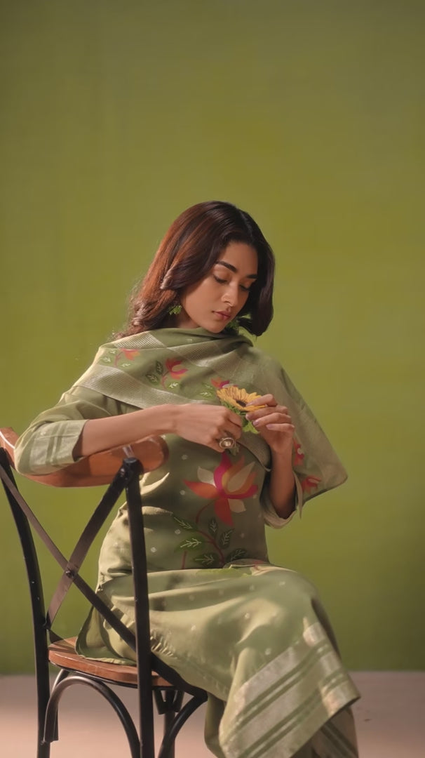 Woven with elegance and adorned with intricate handwork, this Banarasi Chanderi jacquard kurti is a celebration of craftsmanship. Complemented by a tonal viscose bottom and a matching Banarasi Chanderi jacquard dupatta, it creates a look that’s effortlessly graceful and strikingly stylish.