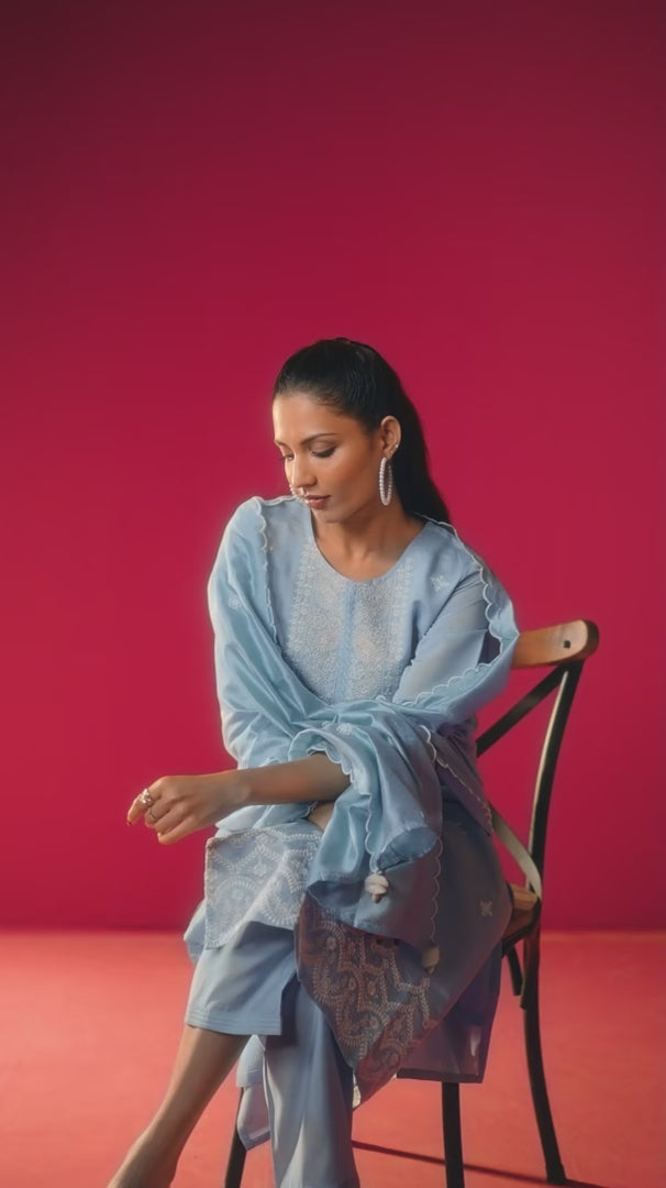 Grace meets craftsmanship in this modal chanderi kurti, beautifully adorned with heavy chikankari embroidery. It comes with a tonal chanderi bottom, and a viscose dupatta highlighted with delicate embroidery and scalloped edges—perfect for a timeless, elegant look.