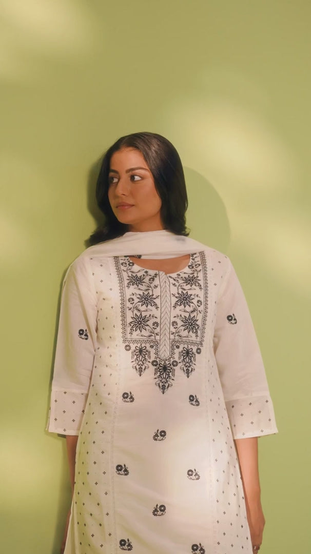 Exquisite handwork elevates this modal chanderi kurti, where intricate chikankari meets a classic table print design. Paired with a tonal chanderi bottom and a coordinating viscose dupatta with scalloped embroidery, it’s an ensemble that celebrates craftsmanship and grace.
