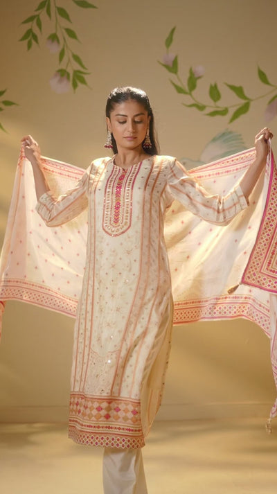 Cream White Viscose Jacquard Position Print Kurta Set