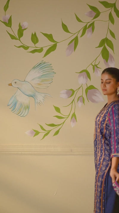 This Deep Indigo Blue kurta set is woven from opulent Russian Jacquard Silk, known for its dense weave and regal, luxurious appearance, striking the perfect harmony of tradition and contemporary elegance, ideal for festive celebrations and special occasions. The kurti is featuring artfully placed position print motifs for a curated, design-forward aesthetic, lending it an artisanal character that truly sets it apart. The set includes a coordinated Viscose Silk bottom and a Russian Silk Dupatta dupatta, presenting a complete, beautifully curated three-piece ensemble. Featuring elegant 3/4th sleeves for a graceful, traditional silhouette. Dry clean only to preserve the delicate fabric and embellishments. Available in sizes M-3Xl.