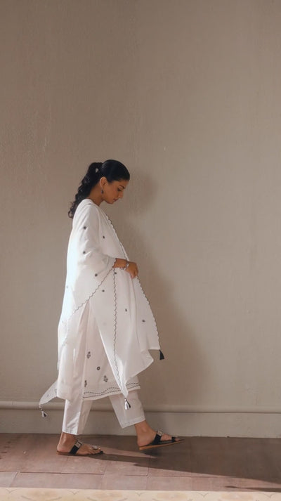 This set features a beautifully embroidered cotton crush kurti with mirror accents, matched with a soft tonal cotton bottom. The accompanying cotton crush dupatta with scalloped detailing adds a refined, graceful touch to your ensemble.