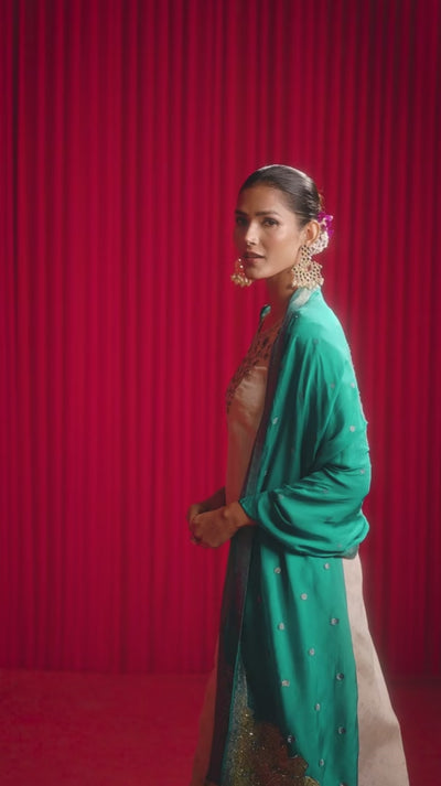 Turn heads with this tissue organza kurti, featuring intricate jacquard patterns and exquisite hand embroidery. Styled with a tonal viscose bottom and a contrasting jacquard dupatta, it’s perfect for festive gatherings or chic day-to-night celebrations.