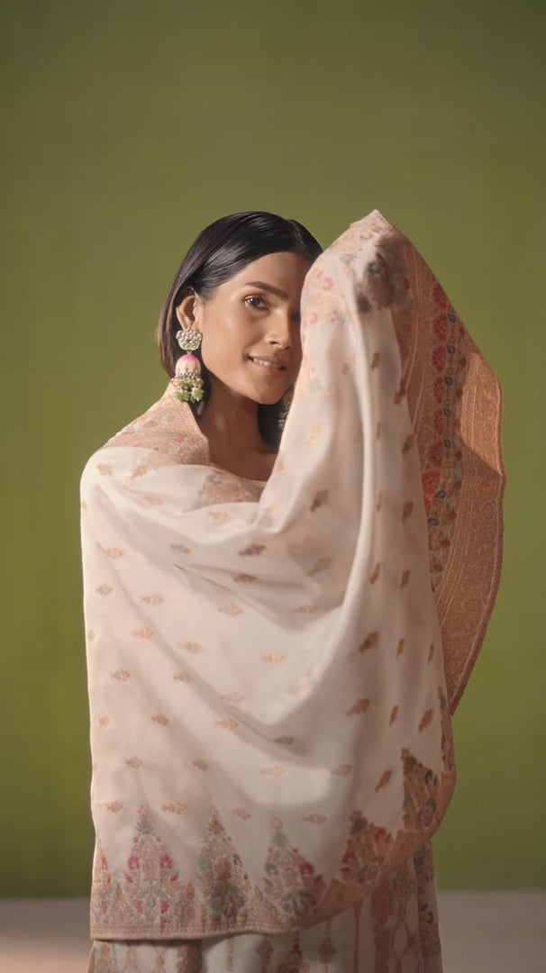 Enter the world of elegance with this Russian jacquard kurti, featuring intricate Meena and handwork that brings every detail to life, complemented by a tonal viscose bottom and a matching jacquard dupatta for a look that’s effortlessly stylish and strikingly graceful.