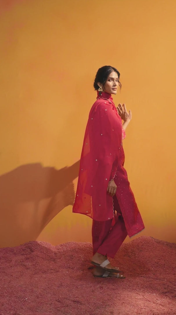 Shine with effortless elegance in this Pink Mirror Embroidery Kurta Set. The all-over self-jacquard kurti is adorned with intricate embroidery and mirror work, reflecting artisanal craftsmanship at every glance. Paired with a tonal viscose bottom, it offers graceful comfort, while the organza scallop dupatta with mirror detailing adds a luminous, ethereal finish.
