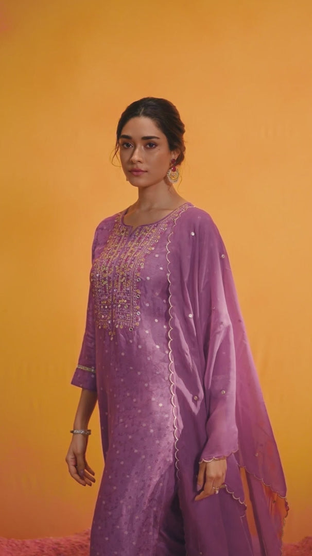 Elevate your wardrobe with the Purple Mirror Embroidery Kurta Set, where craftsmanship meets couture. The self-jacquard kurti is richly detailed with mirror and embroidery work, creating subtle sparkle with every movement. Styled with a tonal viscose bottom and a scalloped organza dupatta, this set balances comfort, elegance, and statement-making design.