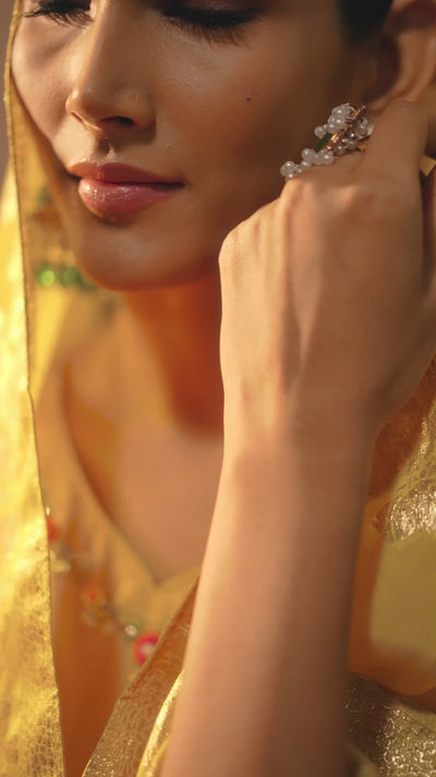 Bring a touch of airy elegance to your festive wardrobe with this Mustard Organza Kurta Set. The pure organza kurta features a placement jacquard design with delicate handwork, paired with a tonal viscose bottom for comfort. Completing the look is a pure organza jacquard dupatta, making this ensemble perfect for weddings, celebrations, or festive gatherings.