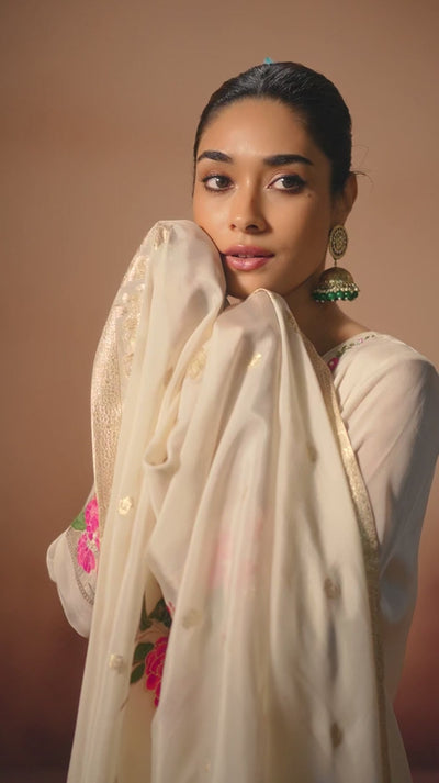 Float through celebrations in ethereal elegance with this Cream Organza Kurta Set. Crafted in pure organza, the kurta features placement jacquard designs enhanced with delicate handwork, lending an airy sophistication to the silhouette. The tonal viscose bottom ensures comfort and ease, while the pure organza jacquard dupatta completes the ensemble with a luminous, graceful fall.