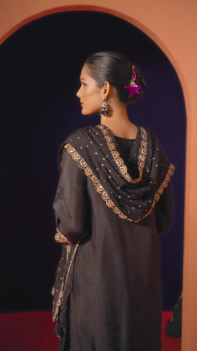 The Ravelyn Black Zari Embroidered Kurta Set is a timeless blend of elegance and grandeur. Crafted in premium Russian silk, the kurta is adorned with zari embroidery, sequin highlights, and table print detailing for a regal appeal. Paired with fluid viscose silk bottoms and a sheer organza dupatta, it balances richness with lightness. Perfect for festive evenings and special occasions, this set is designed to make a statement with effortless grace.
