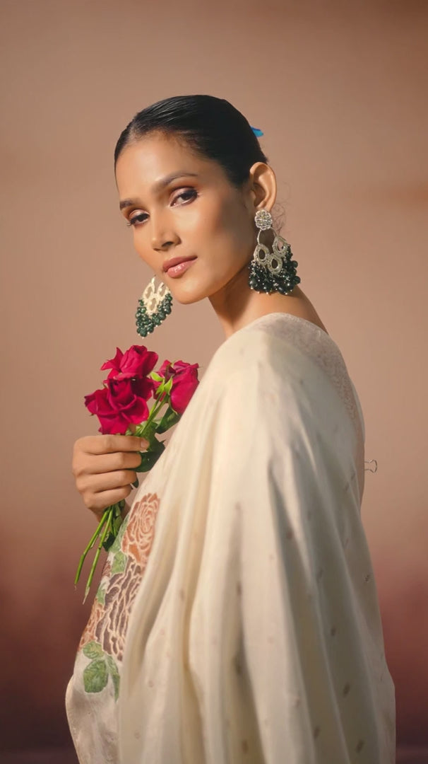 Subtle sophistication finds its form in this Cream Russian Jacquard Set. Crafted in dola silk with intricate placement jacquard motifs and fine handwork details, the ensemble reflects refined artistry. The tonal viscose bottom and dola silk jacquard dupatta complete the look, ethereal, graceful, and imbued with a quiet grandeur perfect for timeless celebrations.