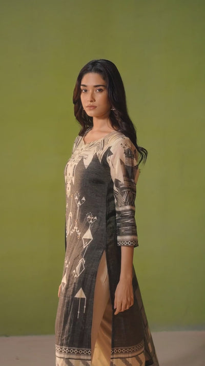 Immerse yourself in effortless luxury with this Black Shimmer Linen Digital Print Set, where artistry meets understated glamour. The linen kurti, adorned with exquisite handwork detailing, reflects timeless sophistication, while the contrast viscose bottom adds a refined edge. Completing the ensemble, a digital print linen dupatta drapes gracefully, a perfect harmony of texture, sheen, and elegance.