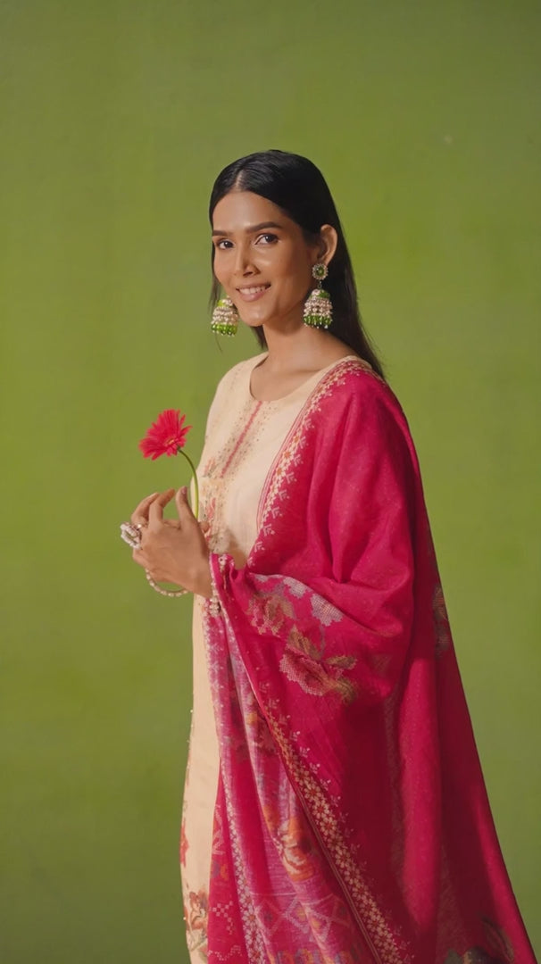 A linen digital print kurti featuring intricate handwork that adds a delicate, artisanal touch, combined with a tonal viscose bottom and a contrasting digital print linen dupatta, that exudes a sense of refined style is just what you need!