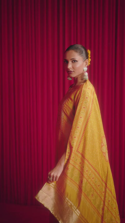 Time to exude timeless elegance with this Russian fabric kurti, featuring rich handwork and heavy embroidery that adds depth and artistry. It has been styled with a tonal viscose bottom and a digital print Russian jacquard dupatta.