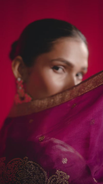 Every thread tells a story in this tissue organza kurti, where all-over jacquard meets meticulous embroidery and handwork. Paired with a tonal viscose bottom and a contrasting jacquard dupatta, it’s an ensemble designed for those who celebrate artistry and timeless elegance.