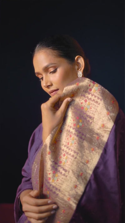Unveil your inner grace with the Velmira Purple Jacquard Organza Kurta Set. This regal silhouette is made from organza jacquard, adorned with intricate hand embroidery that lends depth and dimension. The 3/4th sleeves offer timeless charm, while viscose silk bottoms ensure comfort with finesse. A beautifully coordinated organza jacquard dupatta completes the set, making Velmira a perfect choice for those who dress to stand out — softly and powerfully.