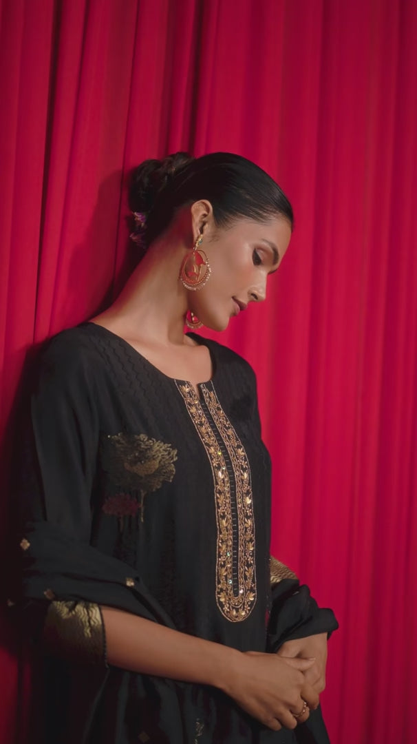 Crafted in luxurious Dola silk, this kurti features exquisite jacquard placement designs enhanced with fine embroidery and handwork. Finished with a tonal viscose bottom and a matching jacquard dupatta, it’s an ensemble that speaks of grace, sophistication, and artistry.